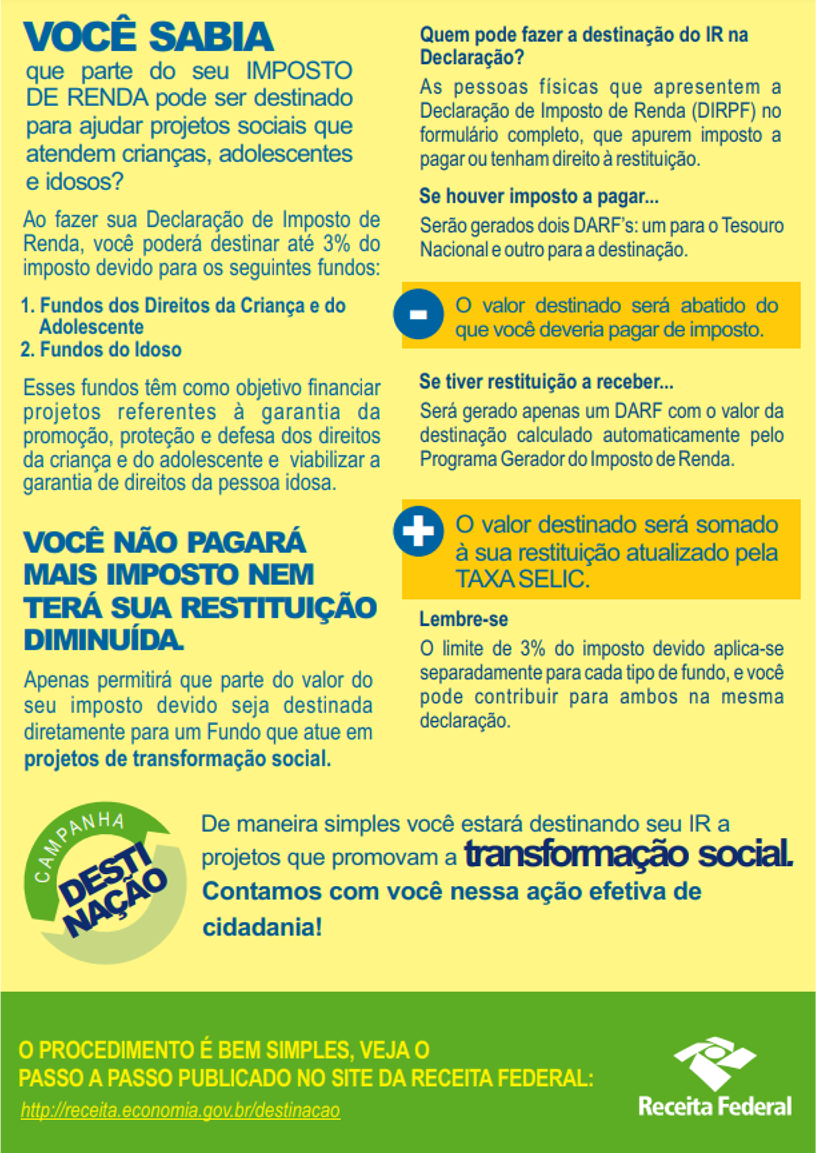 PASSO A PASSO DE COMO FAZER A DESTINAÇÃO 1º) Clique na imagem abaixo: 2º) Preencha o cadastro para fazer a destinação do seu IR (Imposto de Renda) 3º) Escolha a instituição que você deseja beneficiar